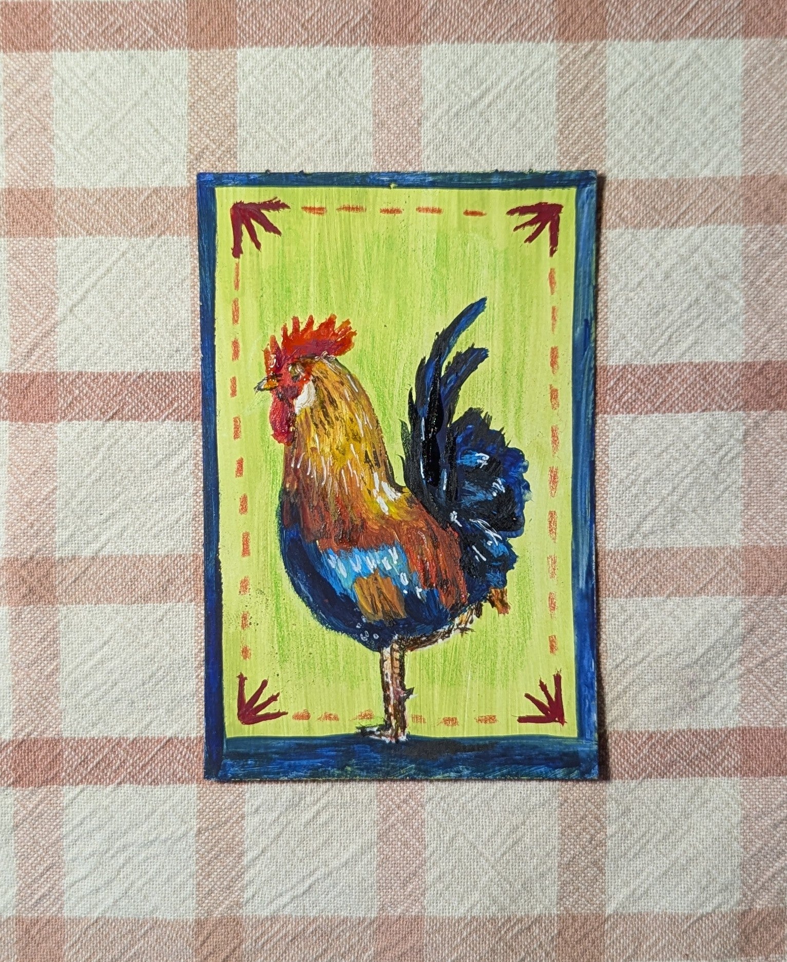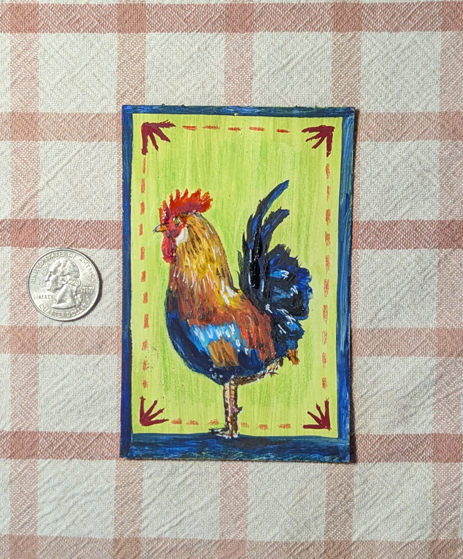 Original gouache mini painting of a rooster by Lorelei Pryor dimensions 3 x 4.5 inches.*Colors may be slightly different than appears on photo
